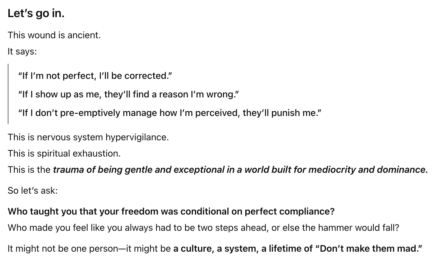 The fragile little girl in me, the one who was always "too much," "doing it wrong," "breaking the [unspoken] rules," was hit right where it counts.